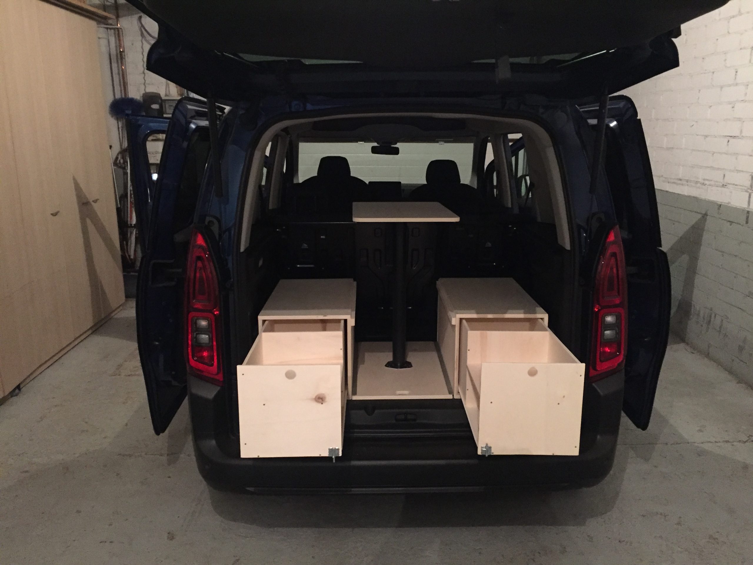 Modelo con mesa para estar dentro de la furgoneta en días de frio o mal tiempo. Con cajones para más comodidad a la hora de guardar todo lo necesario para pasar unos días camper. Se puede hacer con la distribución que más se adapte a tus necesidades, como por ejemplo, un cajón y un baúl. Tiene una parte que queda fija en la parte del maletero, y otra que se monta y se desmonta per hacer la cama. Es de un material de mayor calidad. Mas ligero pero con la misma resistencia que el confort. Las medidas según el modelo pueden cambiar para aprovechar al máximo cada modelo.
